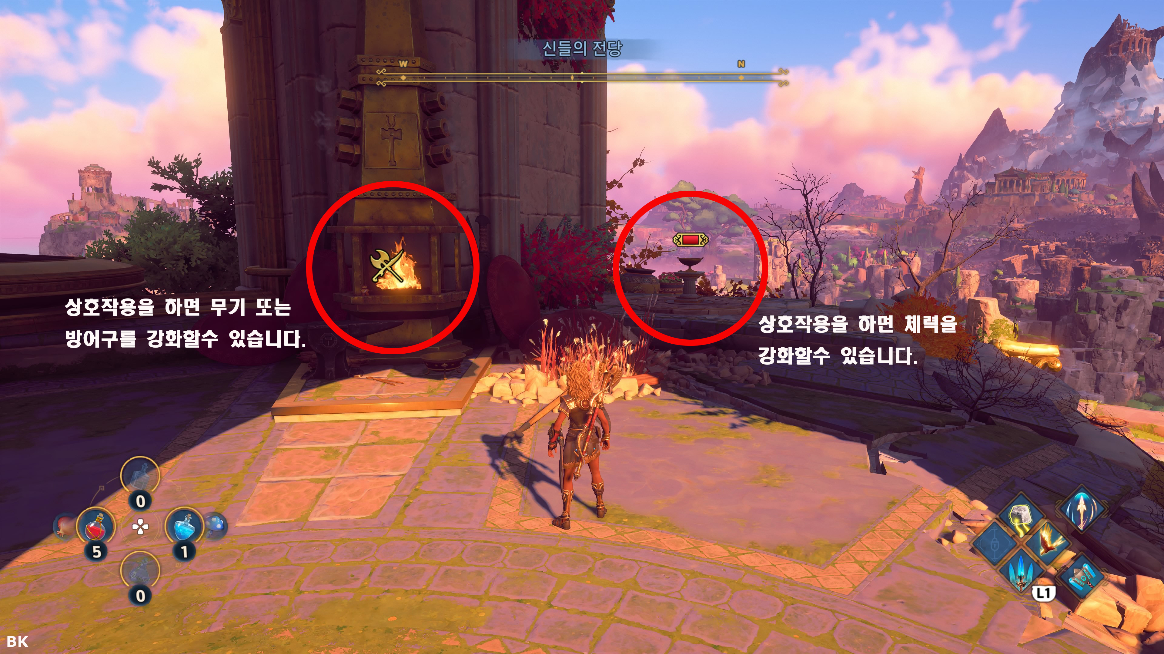 게임을 진행하다 보면 초반에 신들의 전당에 가게 되고 아래 이미지에 보이는 회오리(스틱스강 수조)를 상호작용하면 스킬과 신의 힘을 강화할수가 있습니다. 강화에는 카론의 동전이 필요하며 동전은 신화도전을 클리어 하거나 보물상자에서 얻을수가 있습니다. 스킬과 신의 힘을 모두 배우면 트로피를 얻게 됩니다.