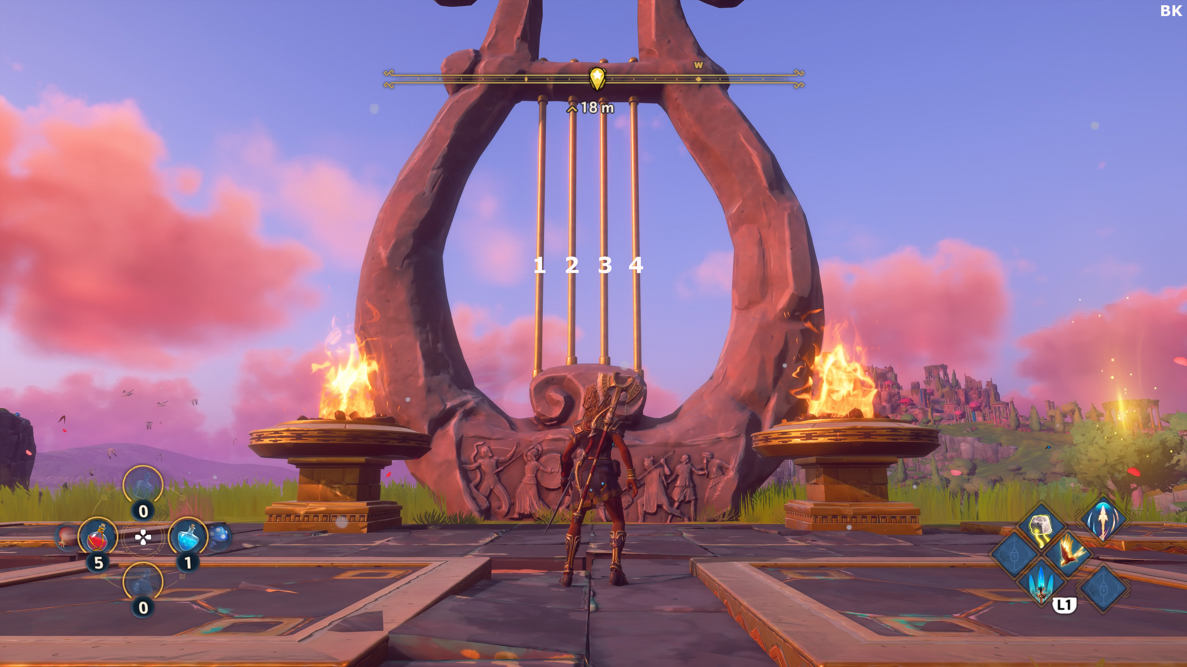 이 도전은 정답만 알면 아주 쉽습니다. 정답을 알면 일일히 작은 리라를 찾아다니며 현의 연주순서를 기억할 필요가 없습니다. 새로운 맵에 도착하면 큰 리라를 찾아 아래에 있는 정답대로 현을 연주 하세요 (이미지에 있는 숫자대로 현을 화살로 맞추면 됩니다.)