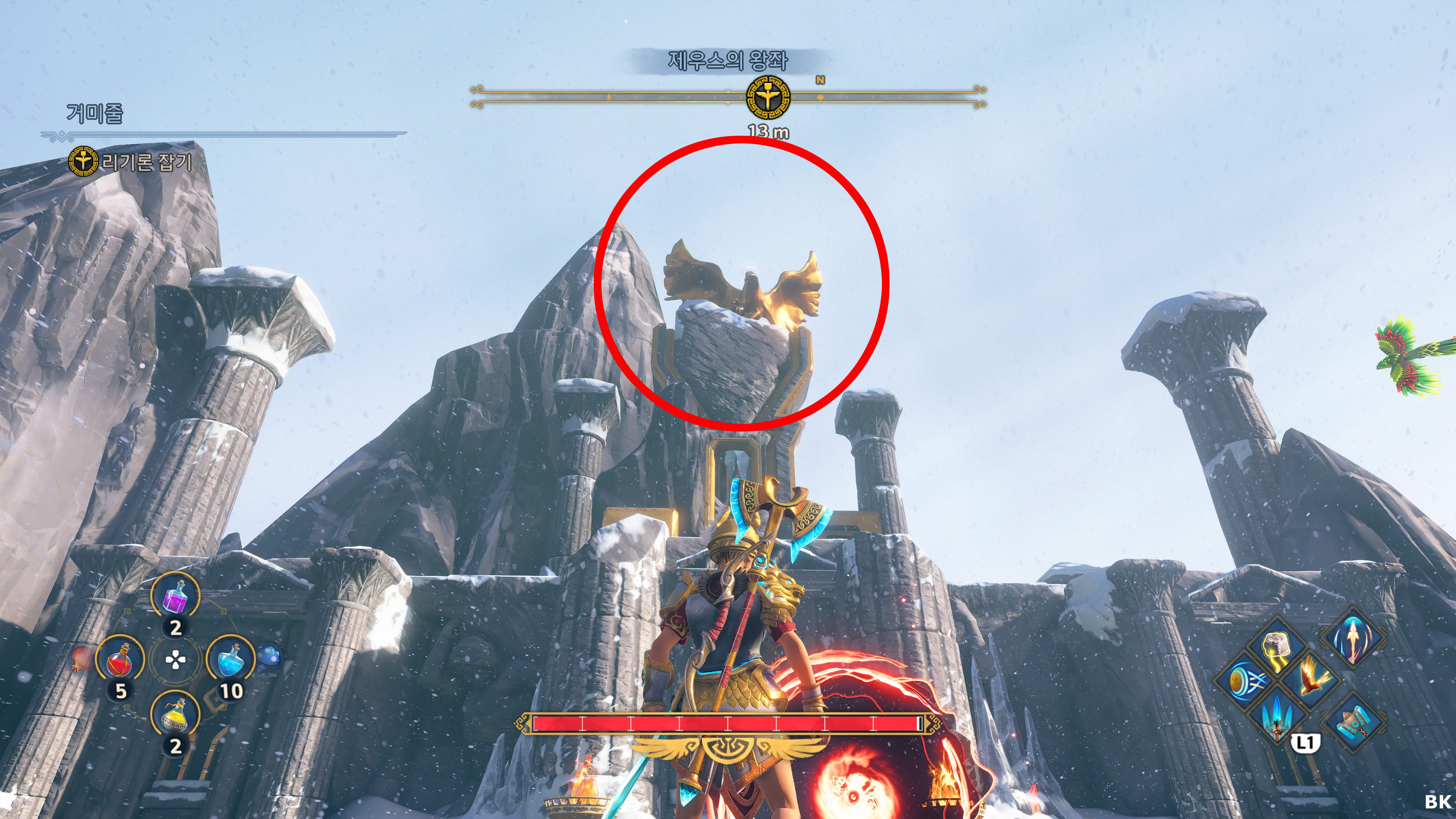 - 아레스의 분노 : 적을 공중으로 날려버리는 기술인데 본인도 같이 점프를 합니다. 이걸 활용하면 이단 점프 후, 아레스의 분노를 사용하면 더 높은 곳으로 올라가는 것이 가능해 집니다. 높은 곳으로 올라가야 하는 퍼즐의 경우 거의 필수 스킬이며 특히 충전된 아레스의 분노를 배울경우 전투가 아주 쉬워 집니다.
