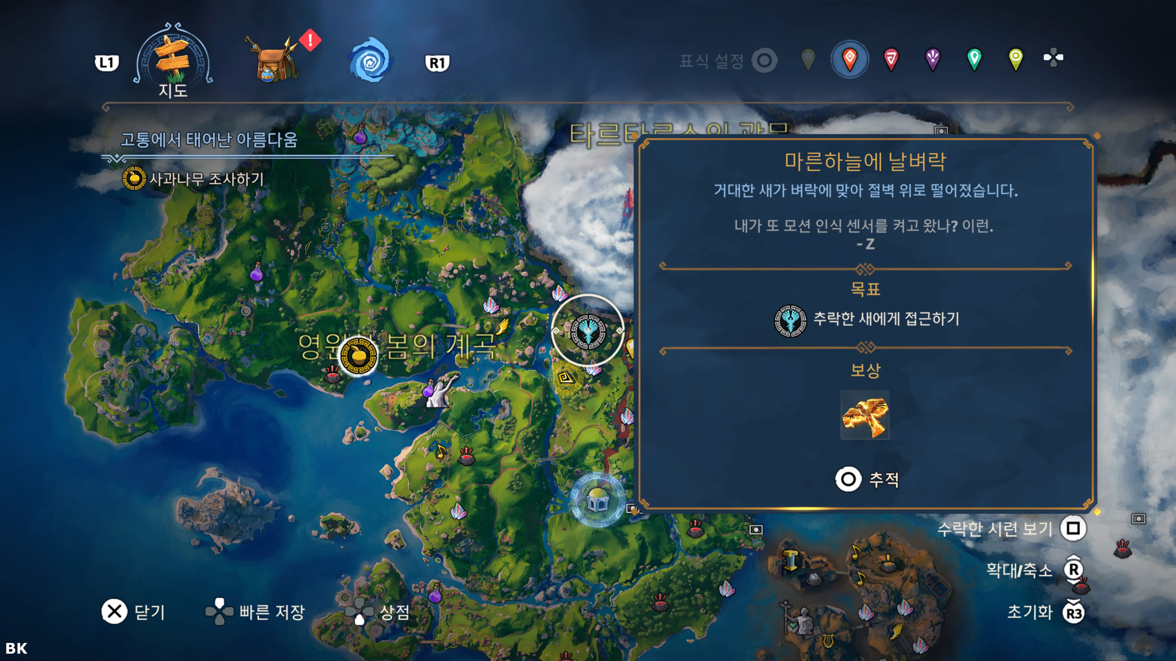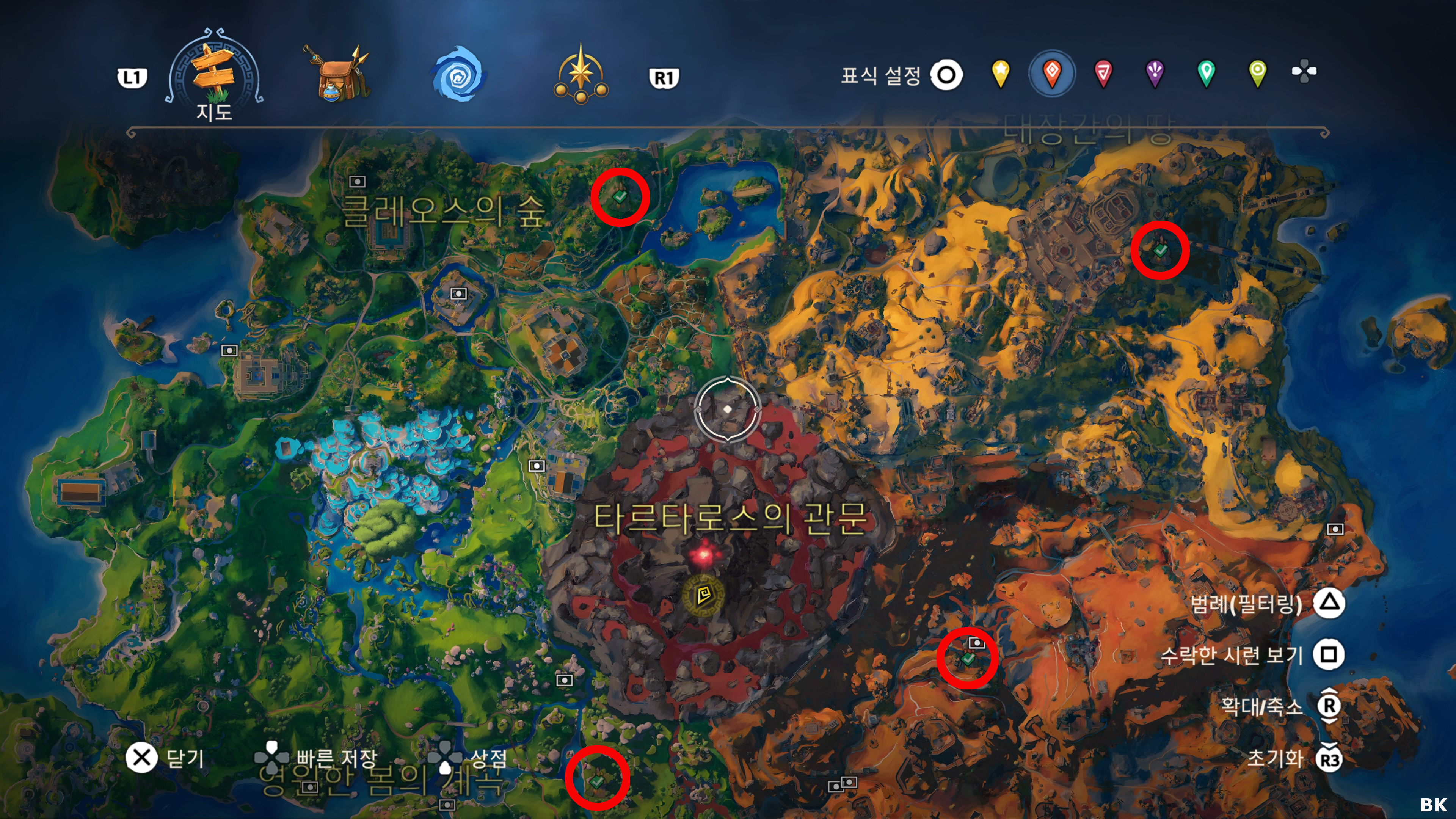 타르타로스의 관문을 제외한 나머지 지역에는 각각 높은 높이의 석상이 하나씩 존재 합니다. 새로운 지역에 도착하면 제일먼저 그 석상에 올라가 상호작용을 하여 정찰을 하세요 그러면 그 지역의 안개가 모두 걷히게 됩니다. 그 후 아날로그 스틱 R3를 길게 누르면 넓은 시야 모드로 전환이 되는데 커서를 움직이다 보면 타르타로스의 동굴이나 보물상자에 가까워지면 패드에서 진동이 옵니다. 이걸 활용하여 동굴이나 보물상자의 위치를 파악해 주세요 나중에 빠진 동굴이나 보물상자의 위치는 아래의 링크를 클릭하시기 바랍니다.