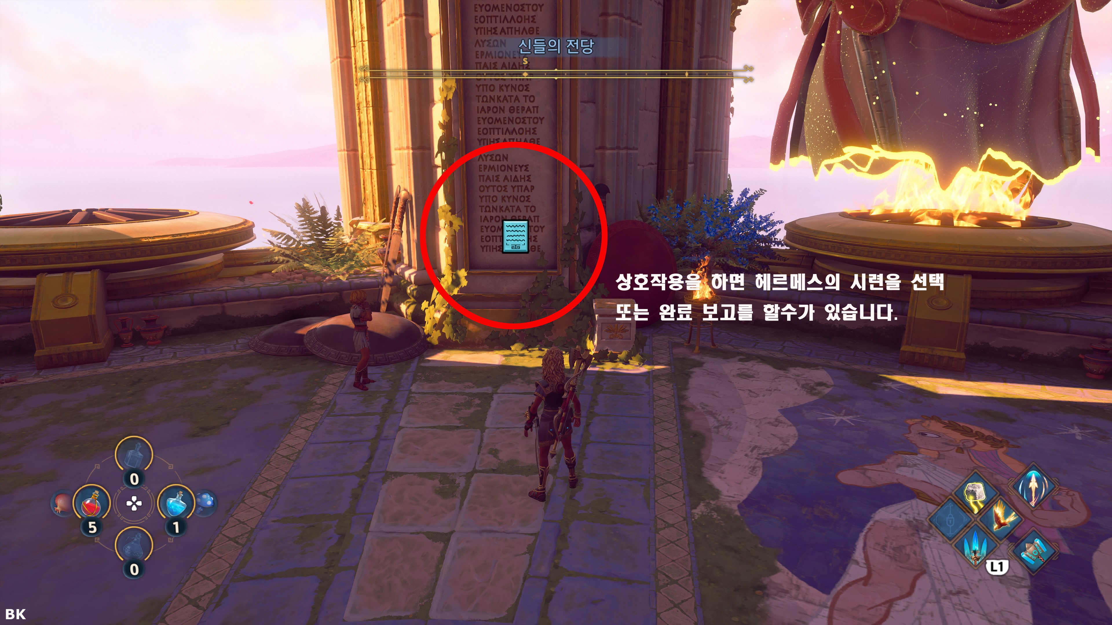 게임을 진행하다 보면 초반에 신들의 전당에 가게 되고 아래 이미지에 보이는 비석을 조사하면 헤르메스의 시련을 선택하여 플레이 할수가 있습니다. 시련은 총 36개로 시련의 내용은 아래의 리스트를 참고해 주세요