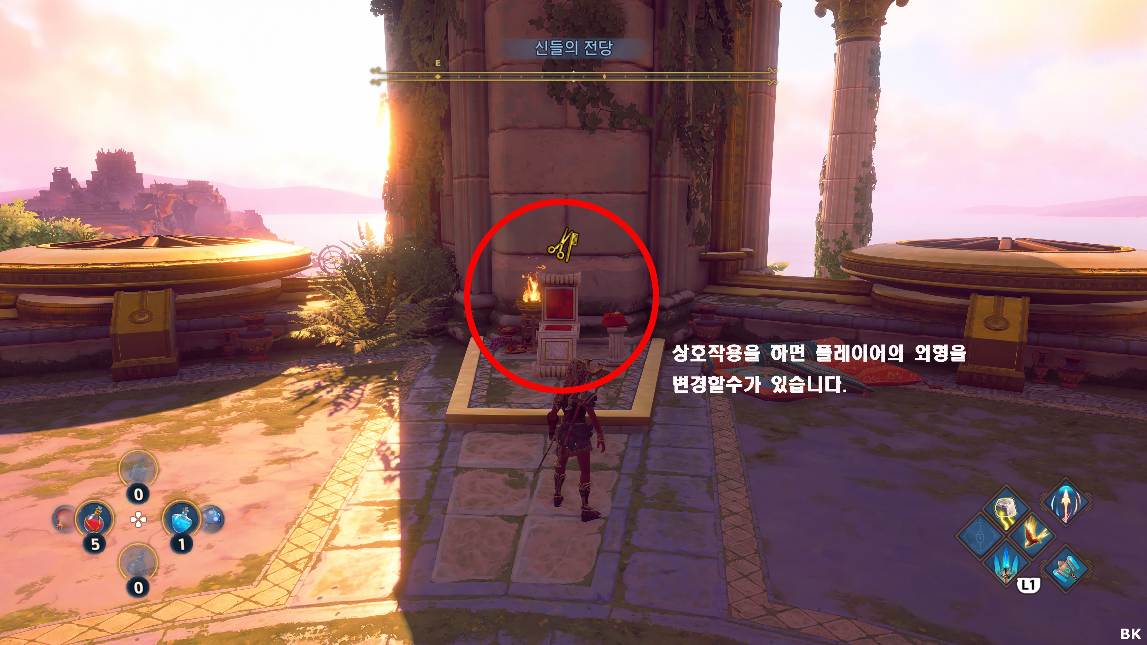 게임을 진행하다 보면 초반에 신들의 전당에 가게 되고 아래 이미지에 보이는 아프로디테의 미용 의자를 상호작용하면 언제든지 주인공의 외형을 바꿀수가 있으며 아무 외형을 한개 바꿔주면 트로피를 얻게 됩니다.
