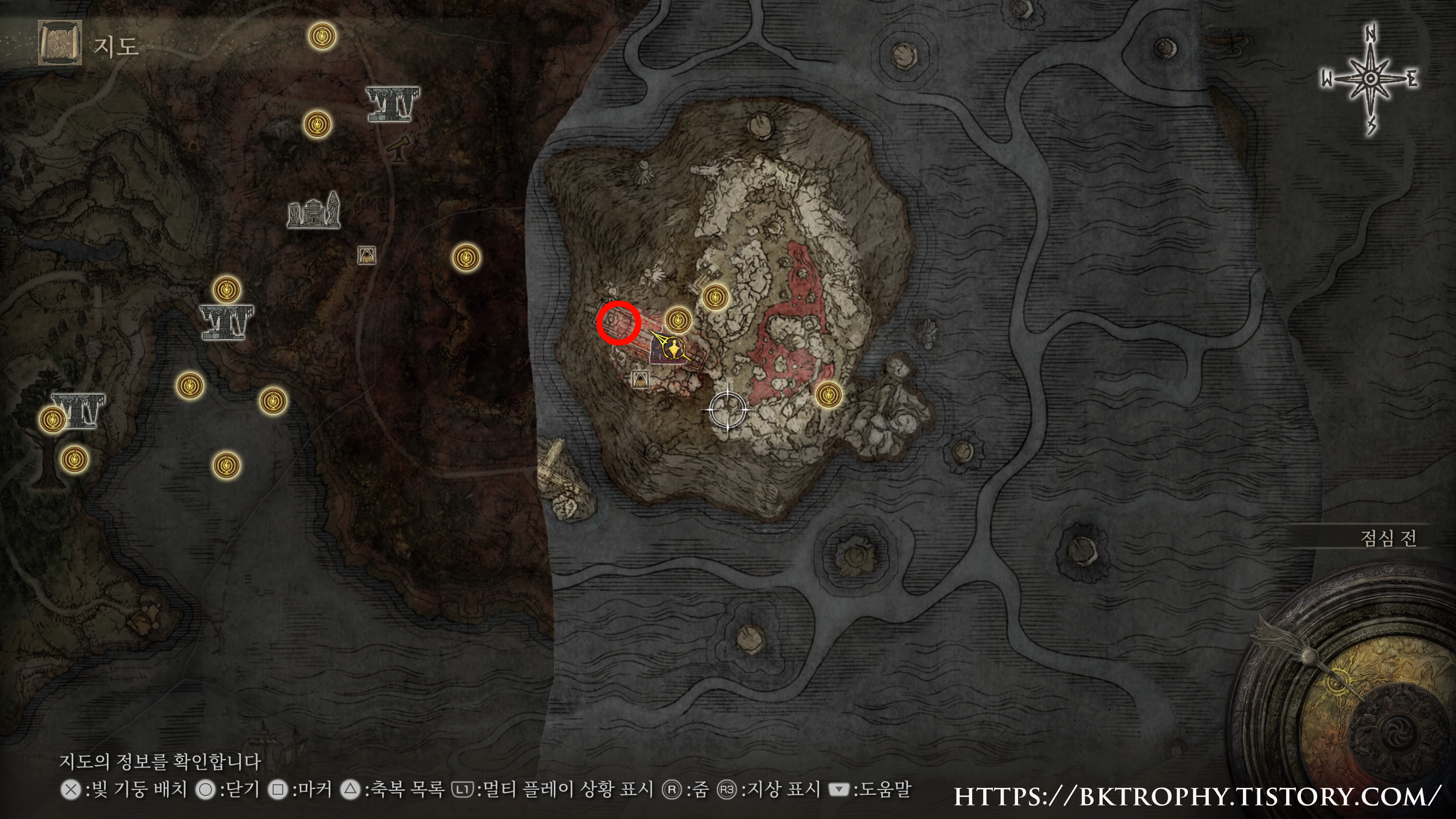 선조령의 왕은 라니 퀘스트를 진행중 가게 되는 노크론에서 만날수가 있습니다. 노크론에 진입하여 전진하다 보면 화신의 물방울과 싸우게 되는데 그후 아래 이미지를 참고로 동그라미 친 곳으로 가면 제단에 화로가 있습니다. 총 6개의 화로에 불을 붙인 후, 파란 동그라미 친 곳으로 가면 사슴의 시체와 상호작용이 가능해지고 상호작용을 하면 선조령의 왕과 싸우게 됩니다.