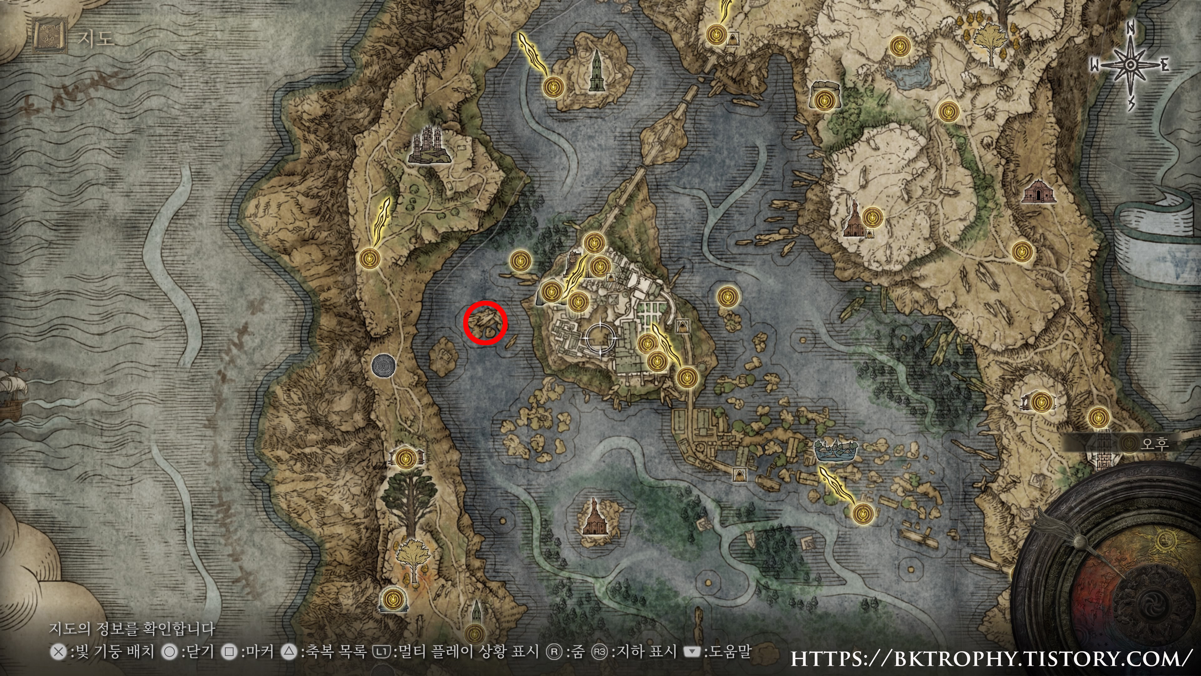 선조령을 만나려면 시프라강 강가에 있는 제단의 화로에 불을 붙여야만 만날수가 있습니다. 화로는 총 8군데로 아래 이미지를 참고로 모든 화로에 불을 붙힌 다음 파란 동그라미가 그려져 있는 각해의 영지로 가면 사슴 시체가 있습니다. 시체와 상호작용하면 선조령과 싸우게 됩니다.