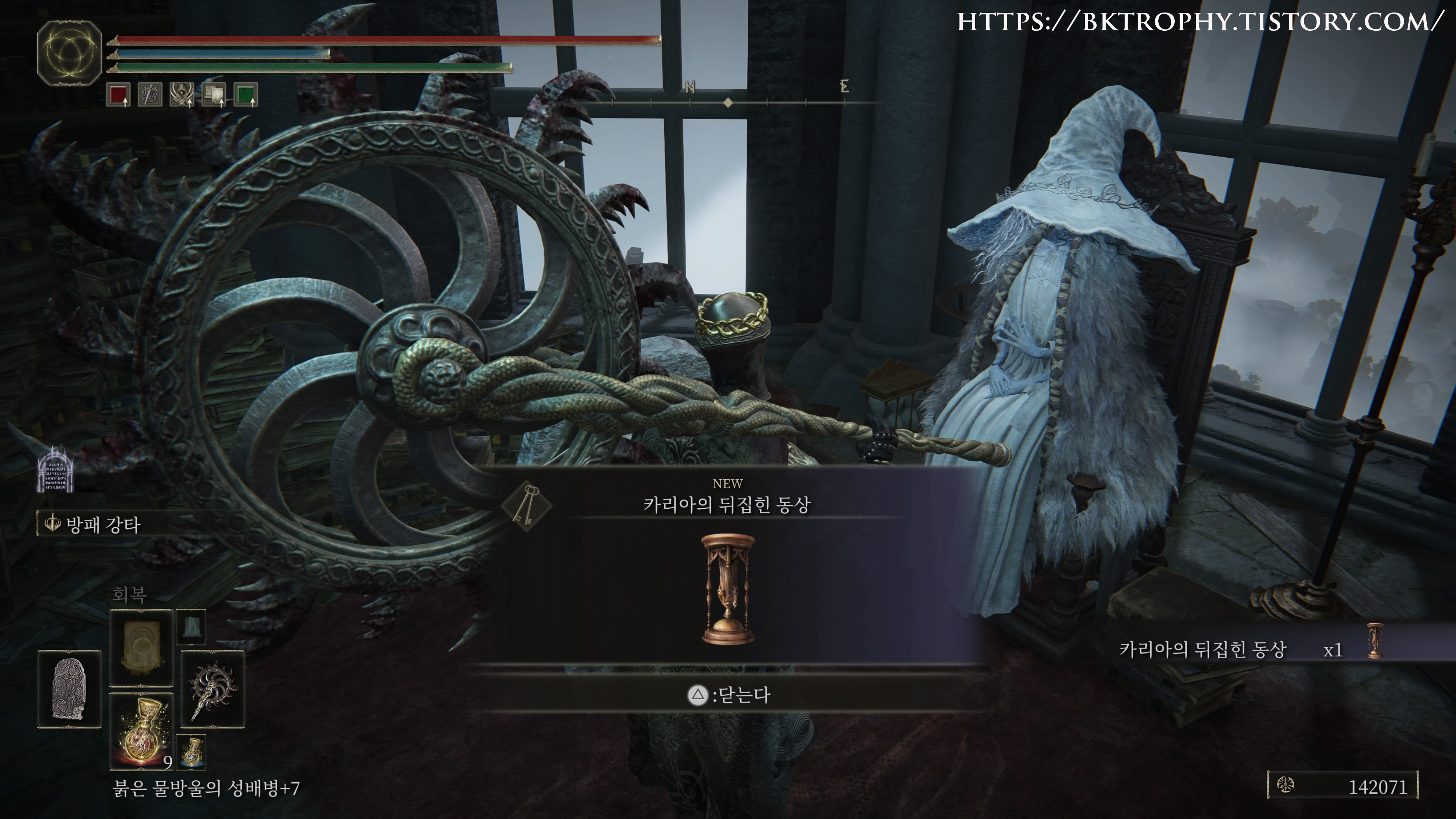 손가락 죽임의 칼날을 얻었으면 다시 라니의 탑으로 갑니다. 라니가 있는 라니의 탑으로 가서 라니에게 칼날을 주면 고맙단 말과 함께 카리아의 뒤집힌 동상을 줍니다. (라니와 두번 대화해야 합니다.) 카리아의 뒤집힌 동상은 나중에 피아 퀘스트할때 꼭 필요한 아이템으로 사룡 포르삭스를 만나기 위한 아이템 이기도 합니다.