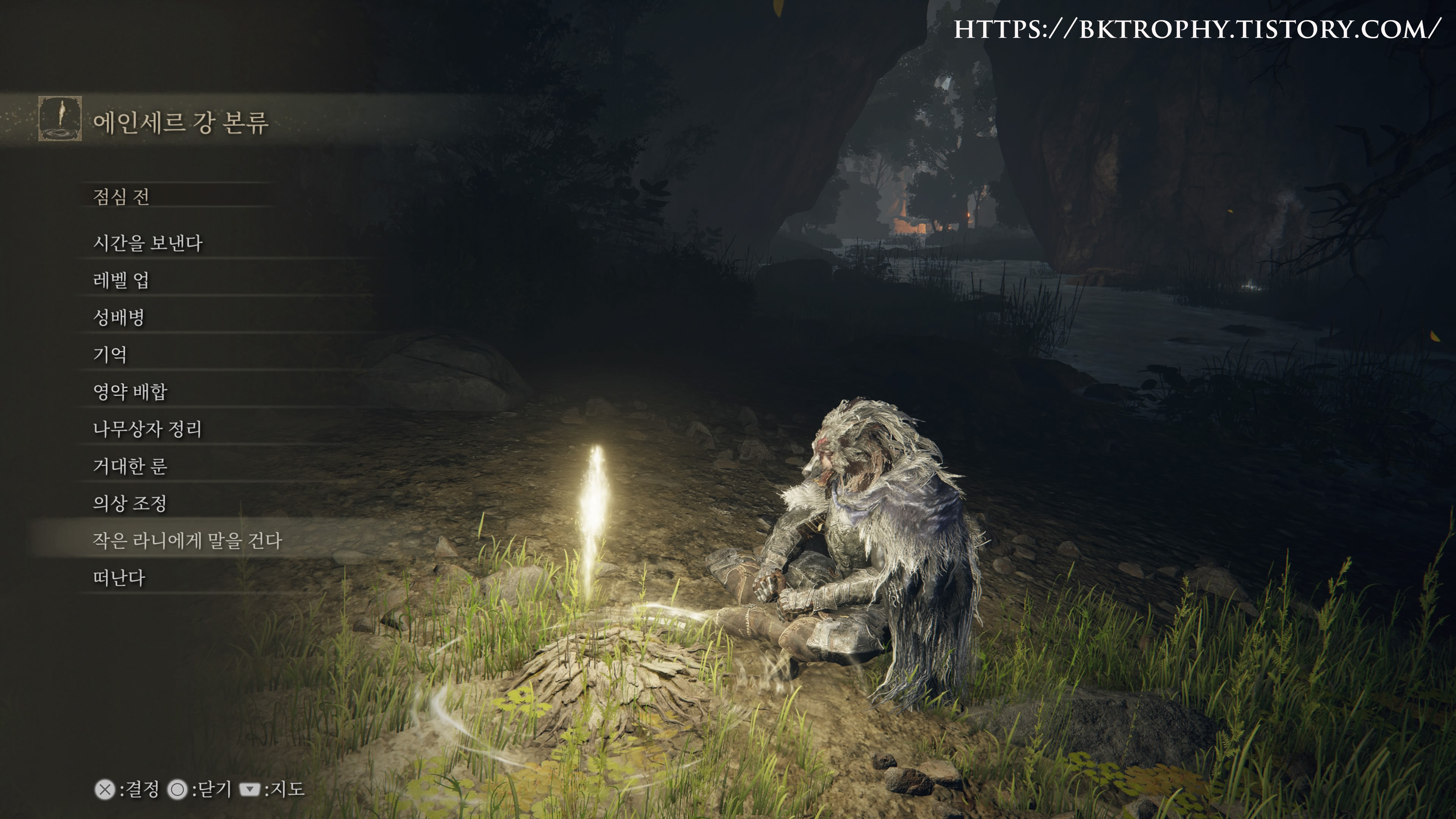 에인세르강에 도착하여 앞으로 조금만 나아가면 석관에 아이템이 있는데 그걸 얻습니다. 그 아이템은 '작은 라니'인데 작은 라니를 가지고 있는 상태에서 축복에서 쉬면 '작은 라니에게 말을 건다'라는 메뉴가 생깁니다. 작은 라니에게 말을 걸면 처음에는 대화를 피하지만 몇번 대화를 반복하면 대화를 하게되고 재앙의 그림자를 없애달라는 말을 합니다.