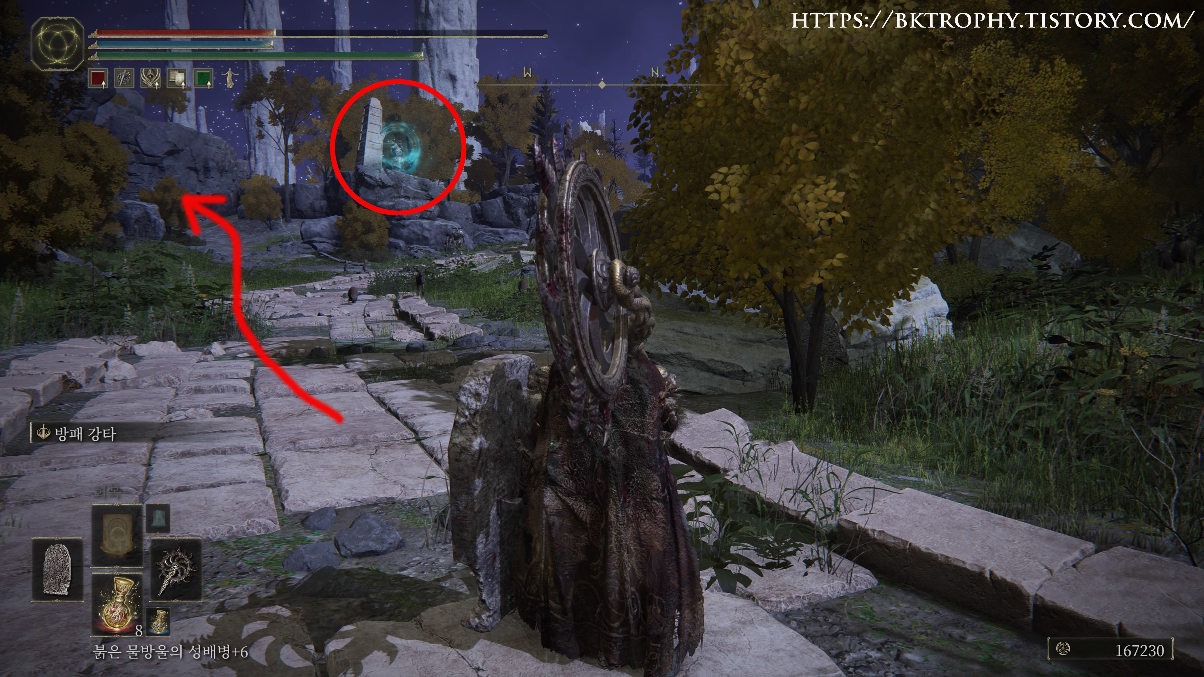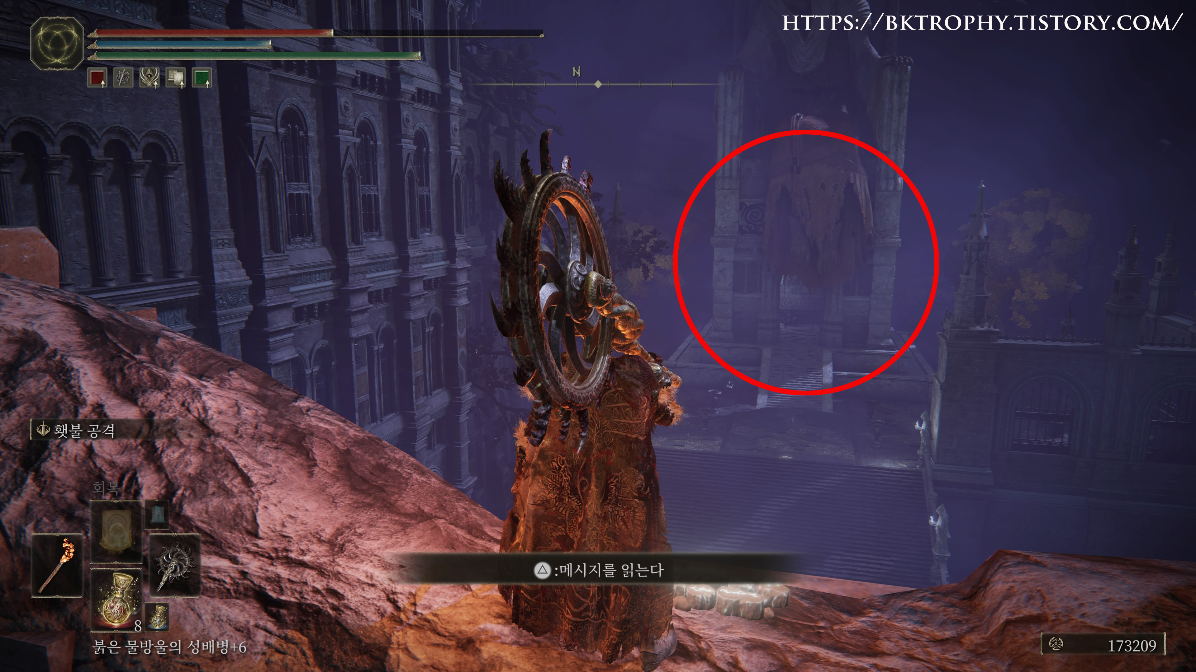 동그라미 친 곳을 확인 했으면 외다리를 건너 건물에 들어가면 석검열쇠로 열수 있는 방이 있습니다. 그곳에는 엘든링 최강의 영체인 화신의 물방울이 있으니 꼭 얻어두시기 바랍니다.