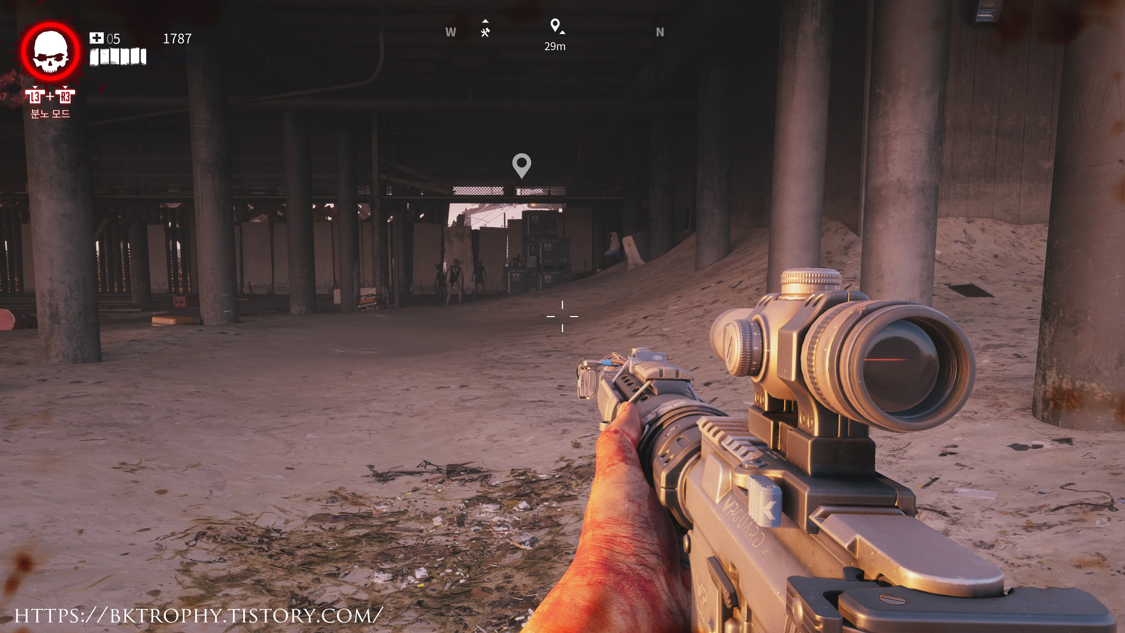 맵 곳곳에 있는 녹색 드럼통을 맞춰 좀비를 부식시키거나 빨간색 드럼통을 맞춰 좀비를 태워도 되고 직접 무기의 슬롯 모드에 상태이상 효과를 달아 좀비를 죽여도 됩니다.