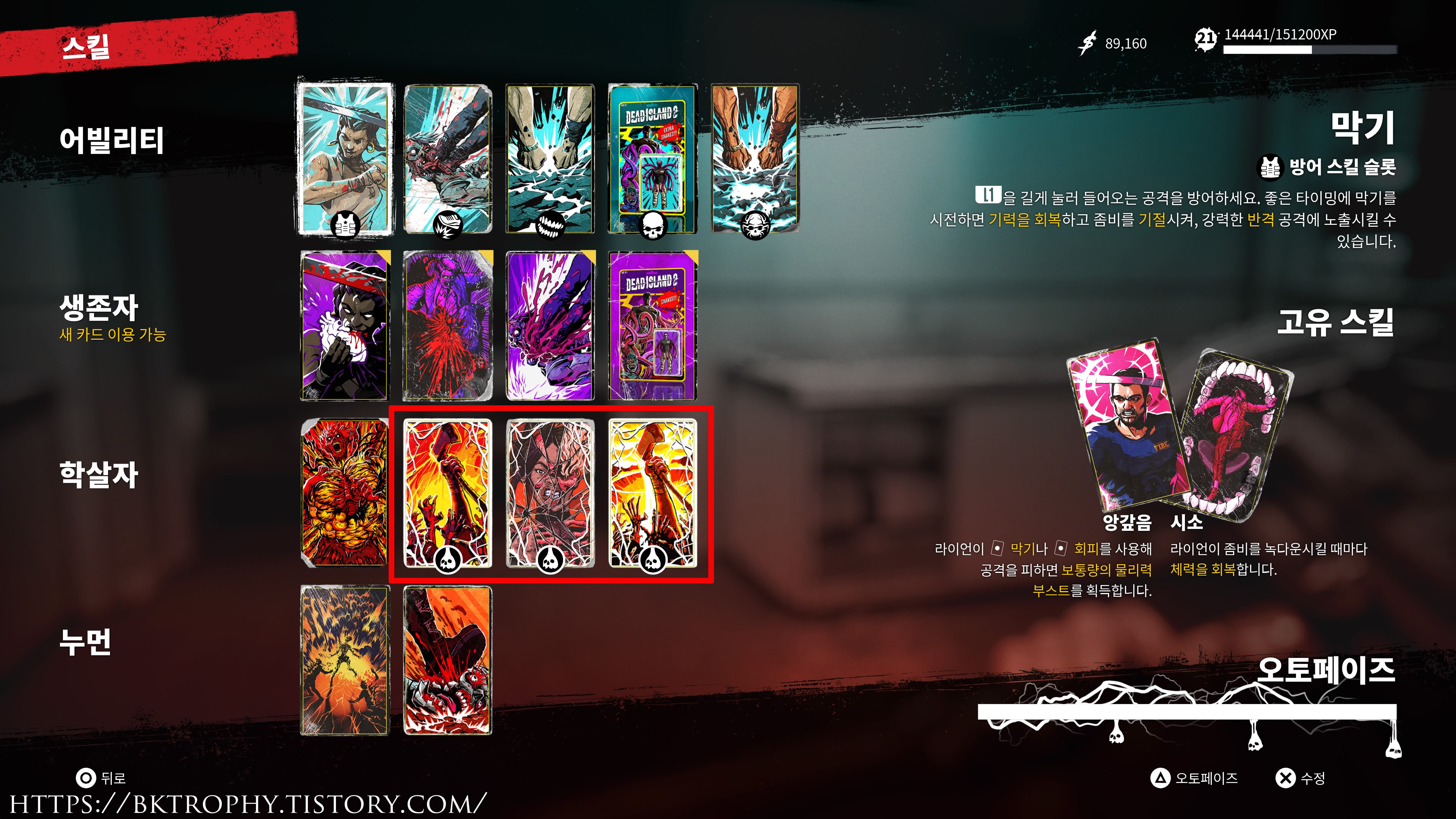 데드 아일랜드 2에서 스킬은 최대 4개의 항목으로 나뉩니다. 어빌리티, 생존자, 학살자, 누먼인데 이중 누먼 항목이 제일 마지막에 해제가 됩니다. 스토리 진행상 누먼 스킬 항목이 해제가 되어 스킬 카드를 장착하면 트로피가 뜨는데 트로피가 안뜬다는 보고가 많이 들어오고 있습니다.