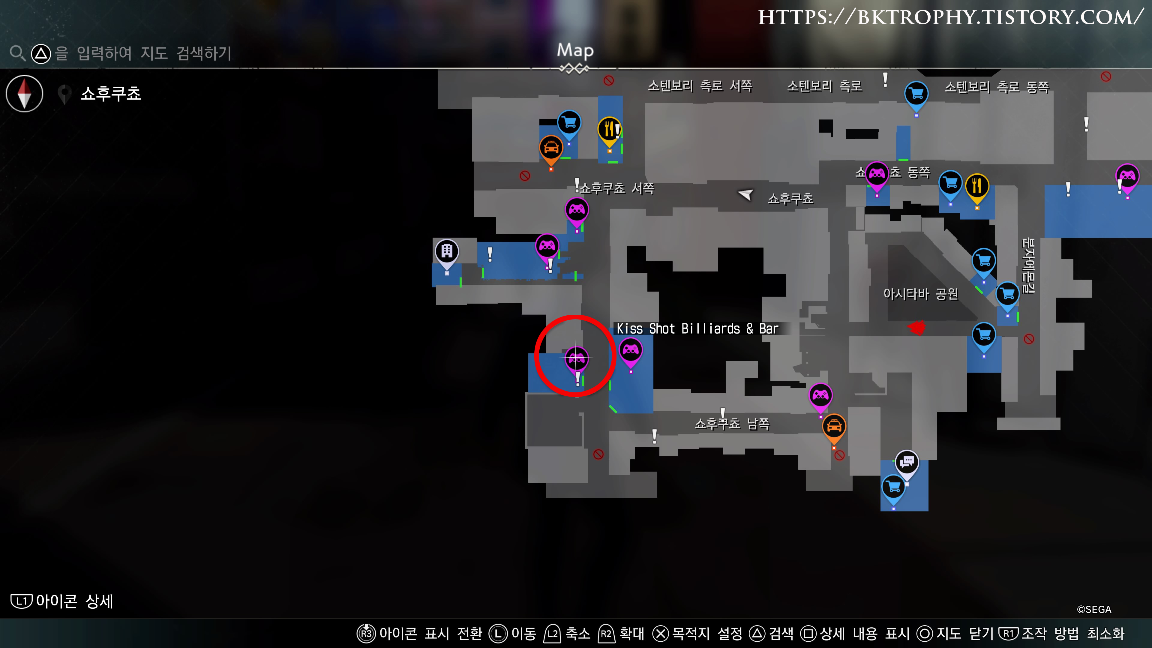 지도에 있는 게임 패드 모양의 가게로 들어가면 각종 플레이 스팟이 있습니다. 소텐보리와 캐슬, 요코하마를 합쳐 10군데의 플레이 스팟에서 놀면 트로피를 얻을수 있습니다.