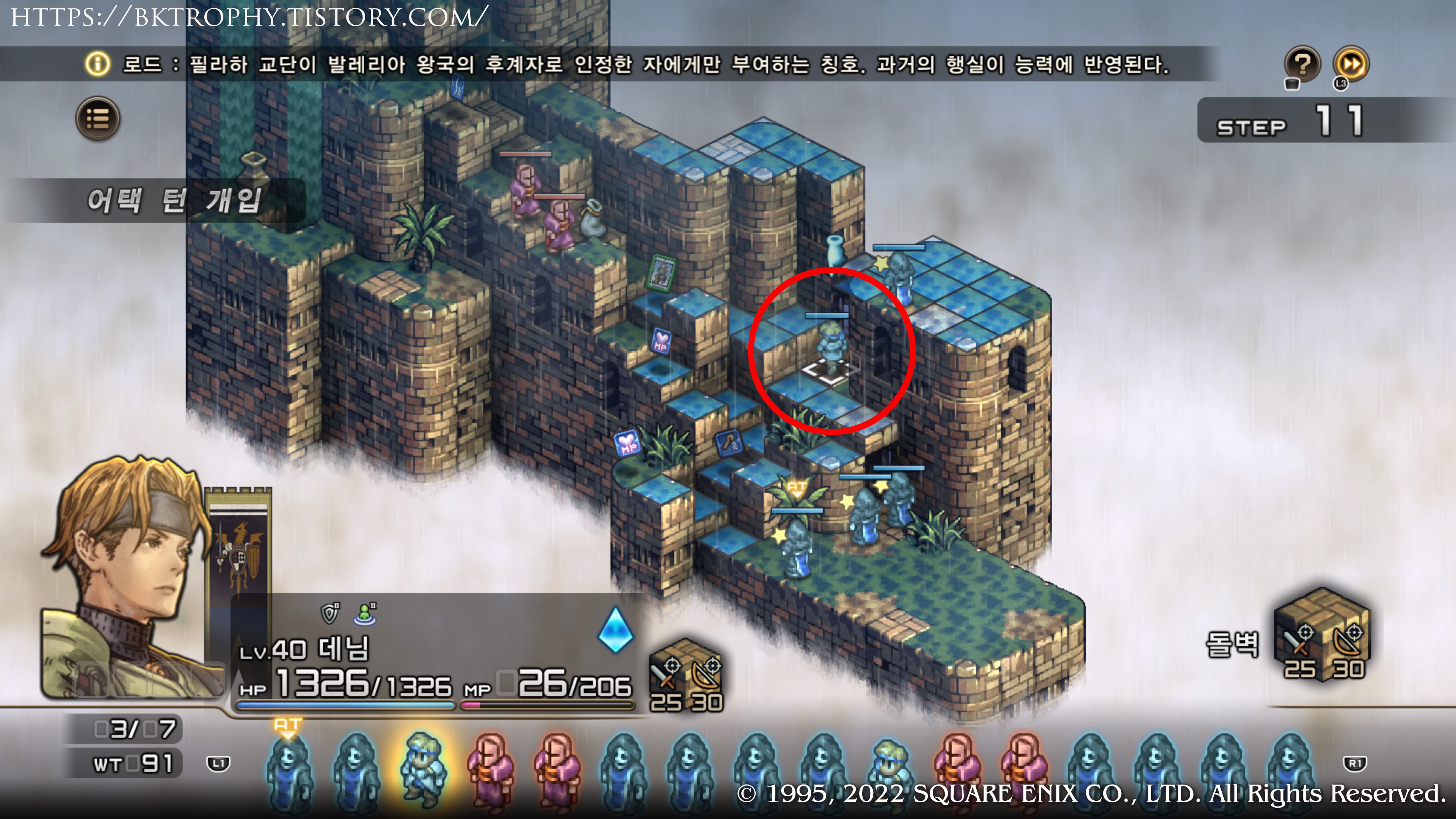 주의 : 바한나 고원에서 전투가 끝난 후 브리간테스성으로 들어갈때 남쪽과 서쪽을 골라서 들어가는데 평화주의자 트로피 획득을 위해서는 반드시 남쪽을 선택합니다. 남쪽으로 가서 전투에 참가하기 전에 출격 인원을 데님 한명만 세팅하고 데님의 무기와 방어구, 장신구 까지 모두 탈착한 후에 전투에 임하면 전투없이 이벤트가 발생하고 평화주의자 트로피를 얻게 됩니다. (모든 무기 방어구, 장신구를 탈착해도 데님 이외의 인원을 더 출격 시키면 트로피 획득이 안됩니다.주의해 주세요)