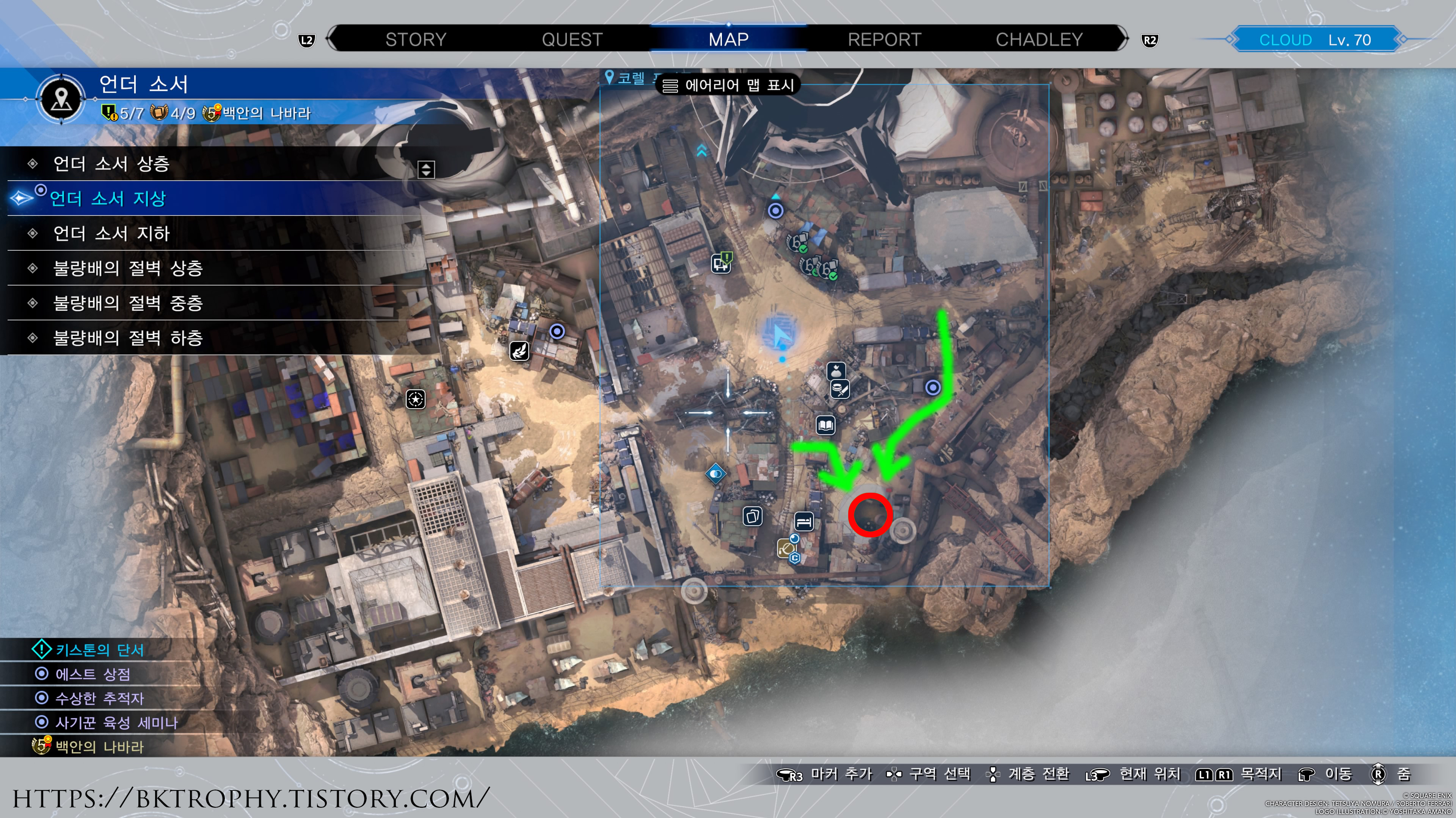 언더 소서의 『비스트 배틀그라운드 : 게스 파티』 3라운드를 모두 승리하면 됩니다. 비스트 배틀그라운드는 언더 주논의 지하에 있으며 빨간 동그라미 친 곳이 지하로 내려가는 입구입니다. (녹색 화살표는 진입 방향이며 동그라미 친 곳으로 가면 아래로 내려가는 사다리가 있습니다.)