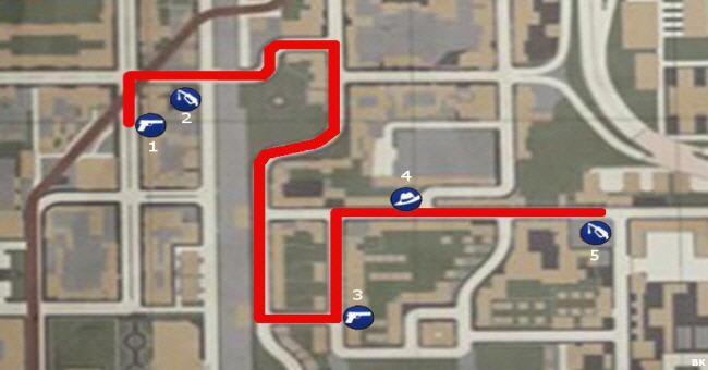 아래의 이미지의 순서대로 5개의 상점을 5분 이내에 털면 트로피를 얻게 됩니다. 상점을 털때 가게 안으로 들어가 총을 꺼내 점원에게 조준한 후에 바로 계산기 앞으로 가서 □버튼을 눌러 돈을 빼낸 후 다른 가게로 가는 방법으로 가게를 털면 쉽게 5분 안에 5개의 상점을 털 수가 있습니다. 점원에게 돈을 달라고 계속 조준하지 말고 조준은 한 번만 하고 바로 계산기에서 돈을 빼내서 다음 가게로 가세요