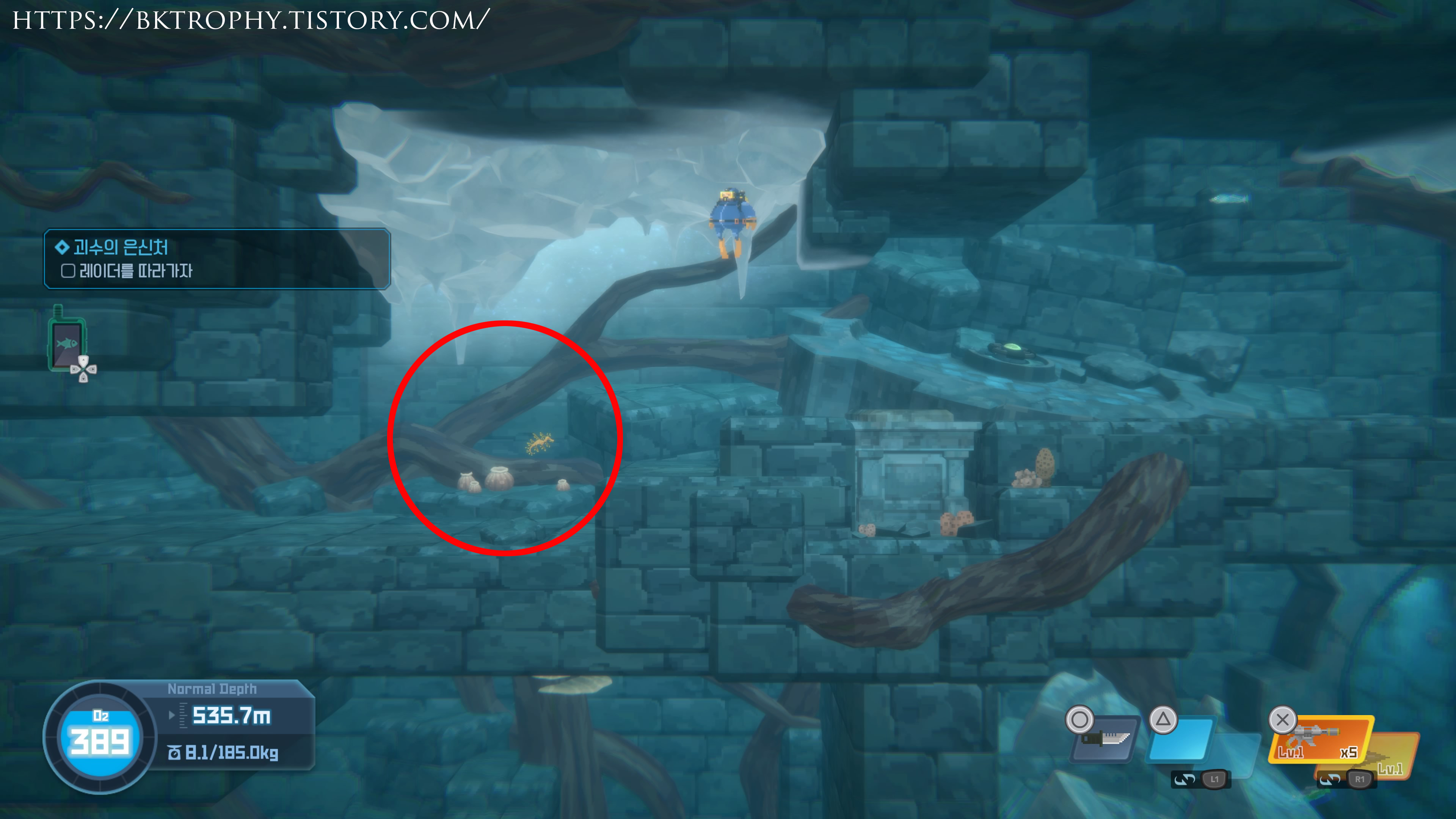 데다다의 트로피중 제일 주의해아 하는 트로피로 챕터 6을 진행하다 보면 씨 블루의 해저기지에 들어가게 되는데 여기서 땅에 떨어진 레이션을 발견할수가 있습니다. (위치는 아래의 이미지를 참고) 레이션을 기지를 전진하다 보면 놓칠수 없는 위치에 있기 때문에 쉽게 발견이 가능하며 □버튼을 눌러 꼭 레이션을 먹어야 합니다. 스토리 진행상 기지를 빠져 나가면 이후로는 더이상 기지를 들어갈수가 없기 때문에 레이션을 놓쳤을 경우 이전 세이브 파일을 로드하여 다시 플레이 하시고 없을 경우 처음부터 게임을 다시 진행을 해야하니 주의하시기 바랍니다.