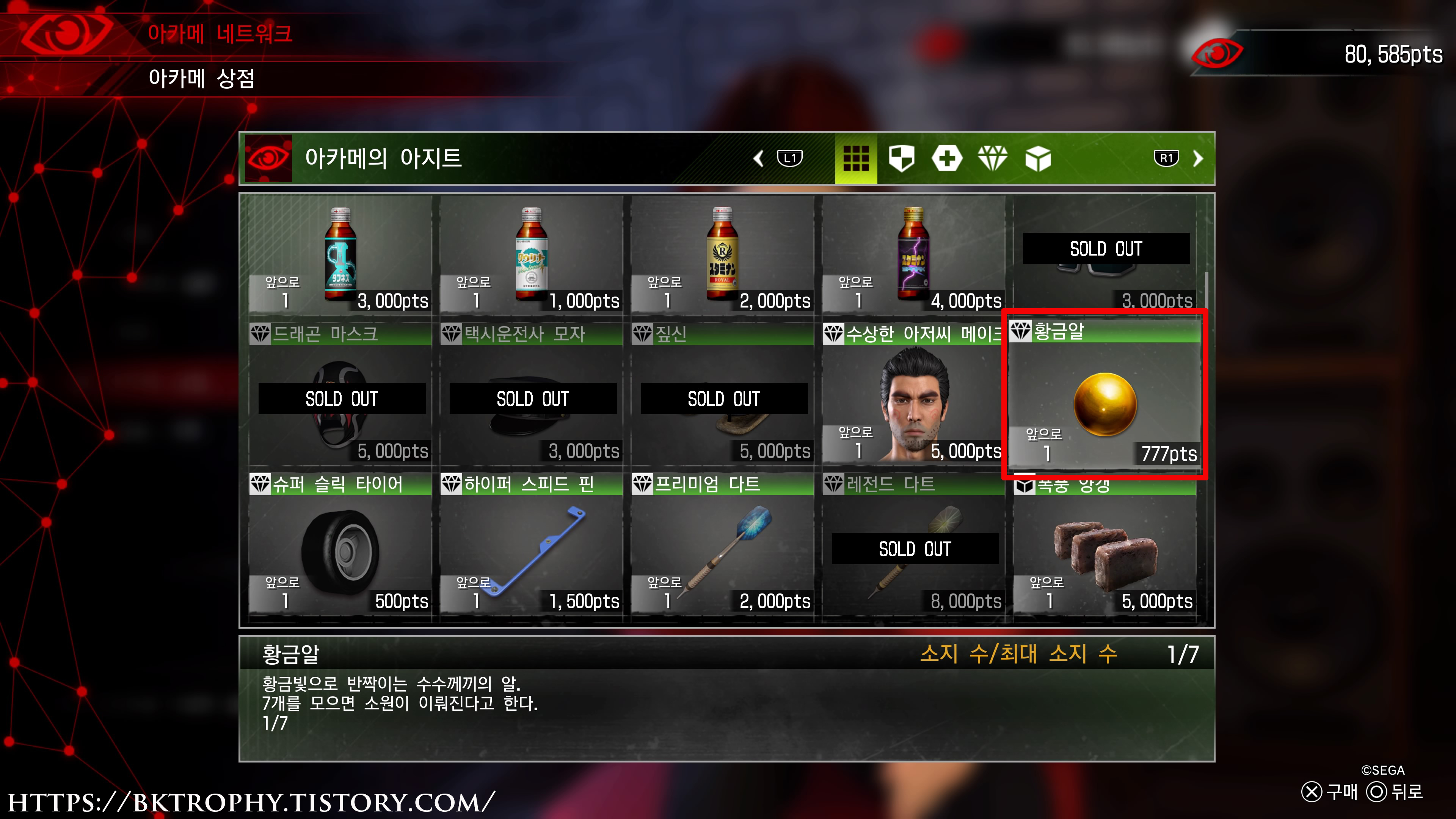 ● 캣맨 - 놓칠수 있는 트로피는 아니지만 주의해야 하는 트로피로 다이빙을 통해 블루홀을 탐험하다 보면 곳곳에 냄비가 떨어져 있습니다. 냄비를 열면 가끔씩 고양이 사료가 나오는데 이걸 초밥집에 있는 모모에게 먹여야 합니다. 문제는 고양이 사료는 하루에 한 번만 주는게 가능하다 보니 나중에 몰아서 트로피 작업을 하려면 상당히 성가십니다. 그러니 게임 진행중 날짜가 바뀌면 바로바로 초밥집에 가서 고양이 사료를 먹여 주세요 총 20일을 먹여야 트로피를 얻을수가 있습니다.