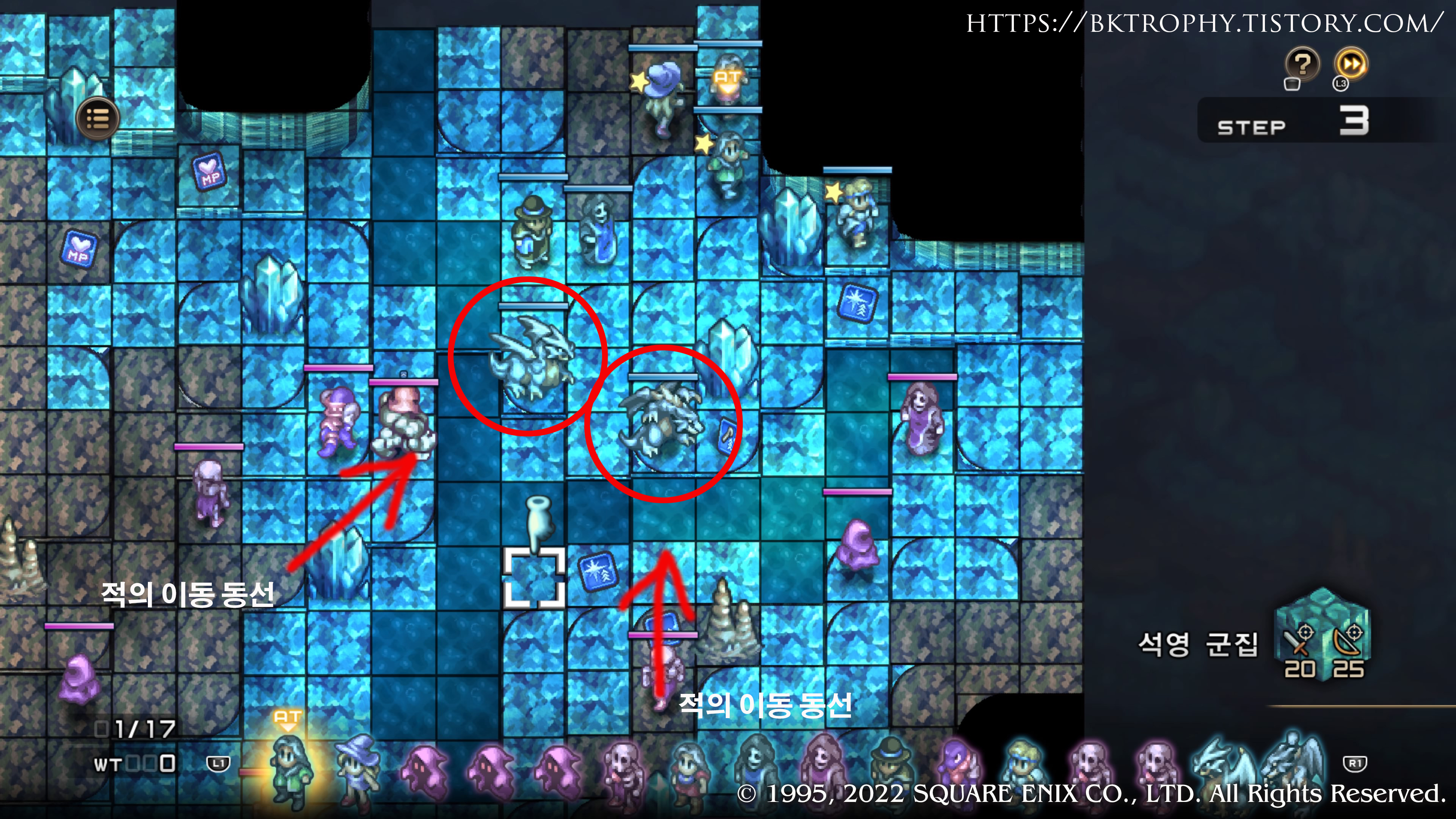 1. 아젤스탄과 관련된 이벤트를 보다 보면 해적의 유적에 가게 됩니다. (아젤스탄와 관련된 이벤트를 못봤어도 이 꼼수는 진행가능 합니다.) 여기서 앞으로 진행을 하다 보면 탄식의 파문까지 가게 되는데 여기를 한번 클리어 한 이후에 다시 오면 가끔가다 리치가 나올때가 있습니다. (아래 이미지의 동그라미 친 적이 리치입니다. 특이한 점은 이 맵의 적들은 우리편의 레벨보다 1레벨 위의 레벨로 등장합니다. 예를들어 현재 파티의 레벨이 40이면 41의 적이 등장합니다.)